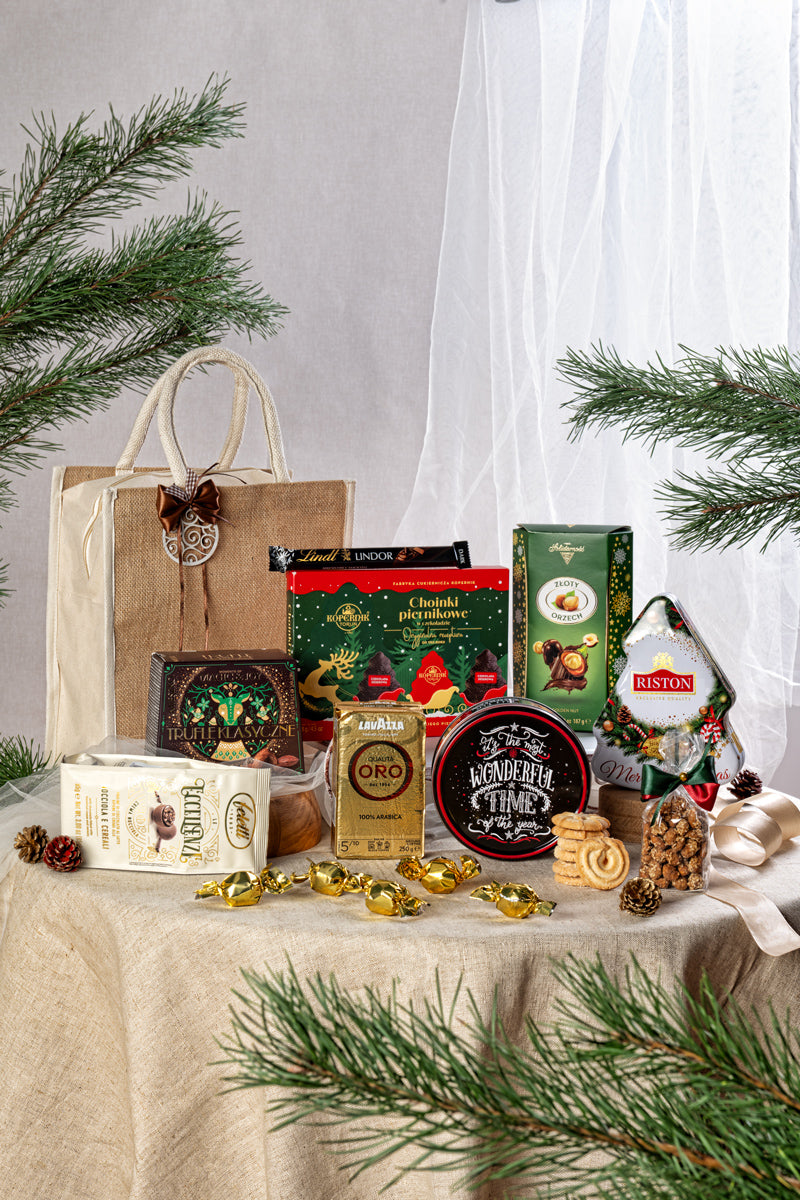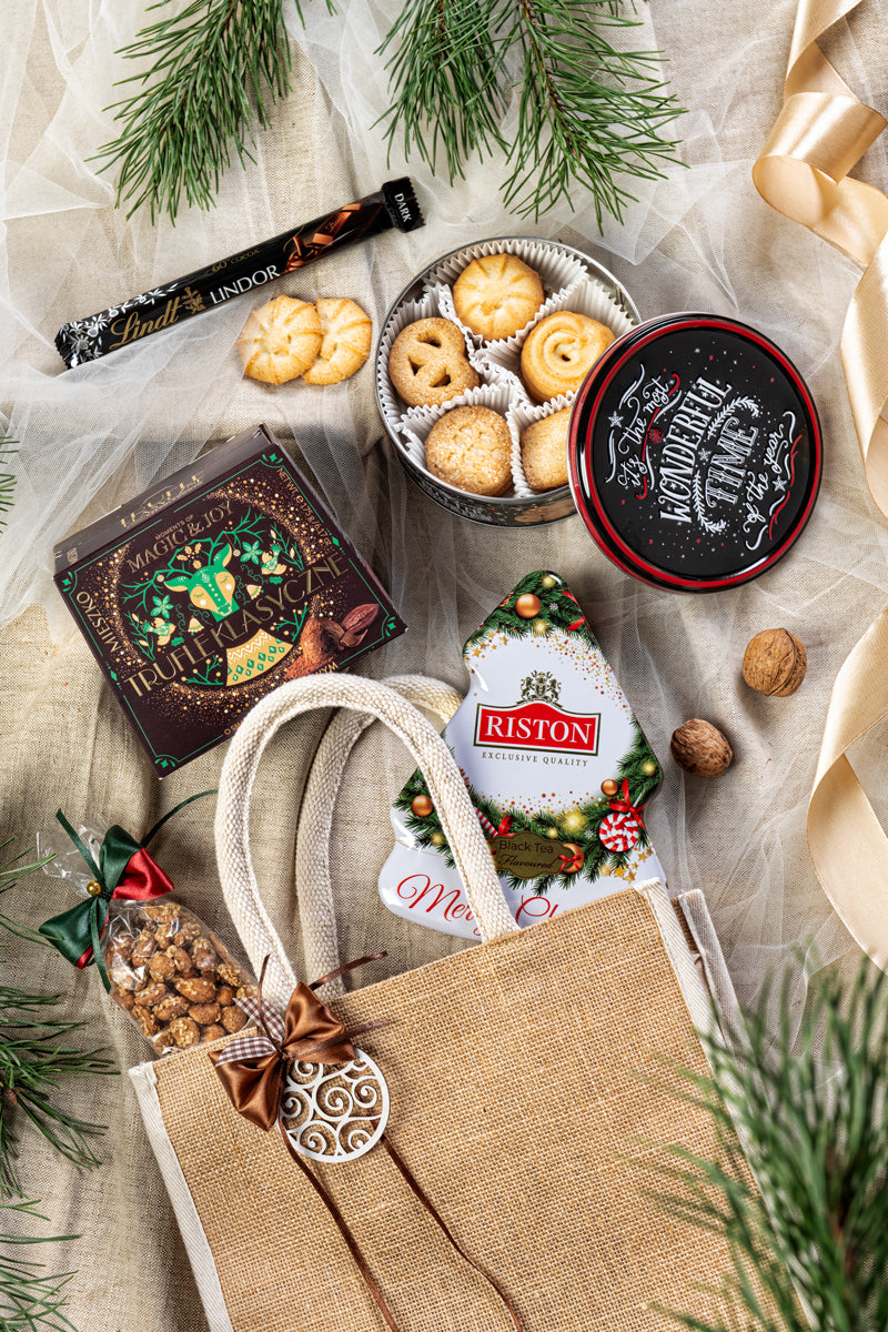 Całość zapakowana jest w elegancką i praktyczną jutową torbę zamykaną na zamek, ozdobioną świąteczną dekoracją. To nie tylko piękne, ale i funkcjonalne opakowanie, które można wykorzystać ponownie. Wymiary torby: 28 x 17 x 30 cm.