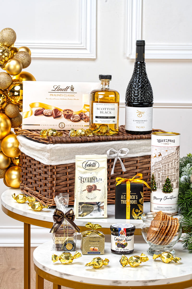 Ekskluzywny Kosz Prezentowy dla Dwojga z Whisky i Winem – Świąteczny Upominek