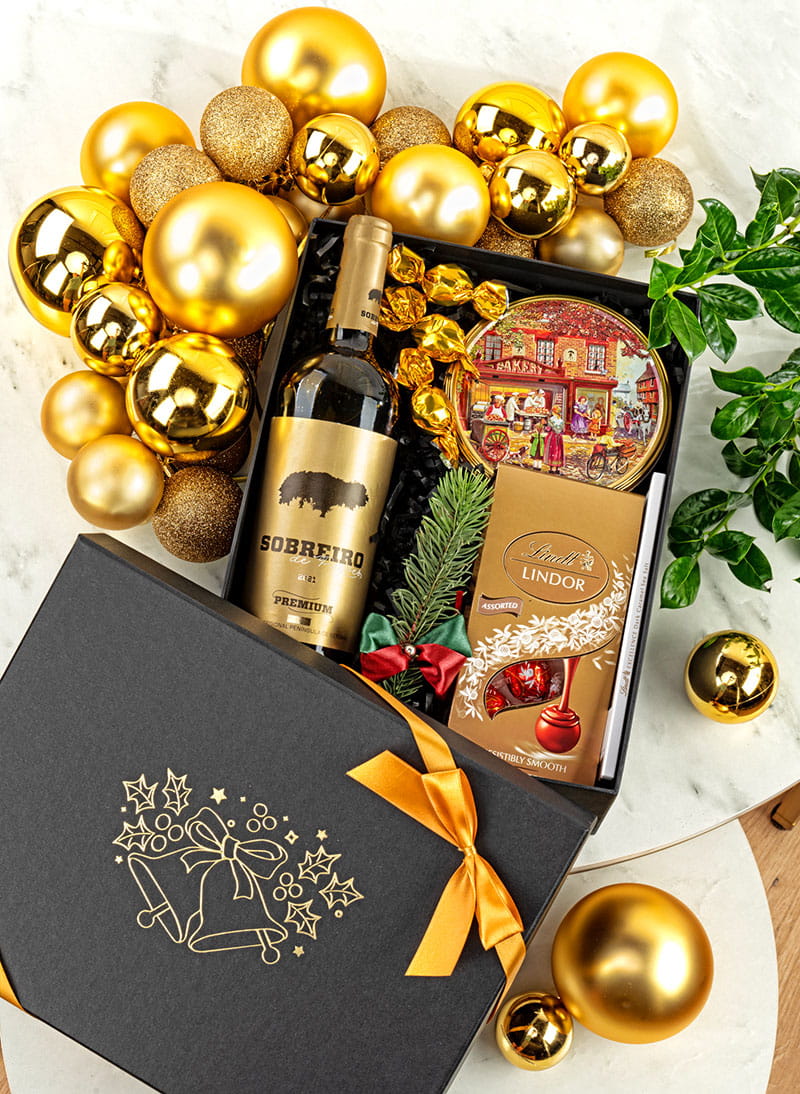 Zestaw umieszczony jest w czarnym, ekskluzywnym pudełku o wymiarach 32x24x10 cm, ozdobionym świąteczną grafiką z efektem hot-stampingu. Lśniące, trójwymiarowe motywy na wieczku nadają mu niezwykle szlachetny i świąteczny charakter. To nie tylko prezent – to elegancki gest w wyjątkowej oprawie.