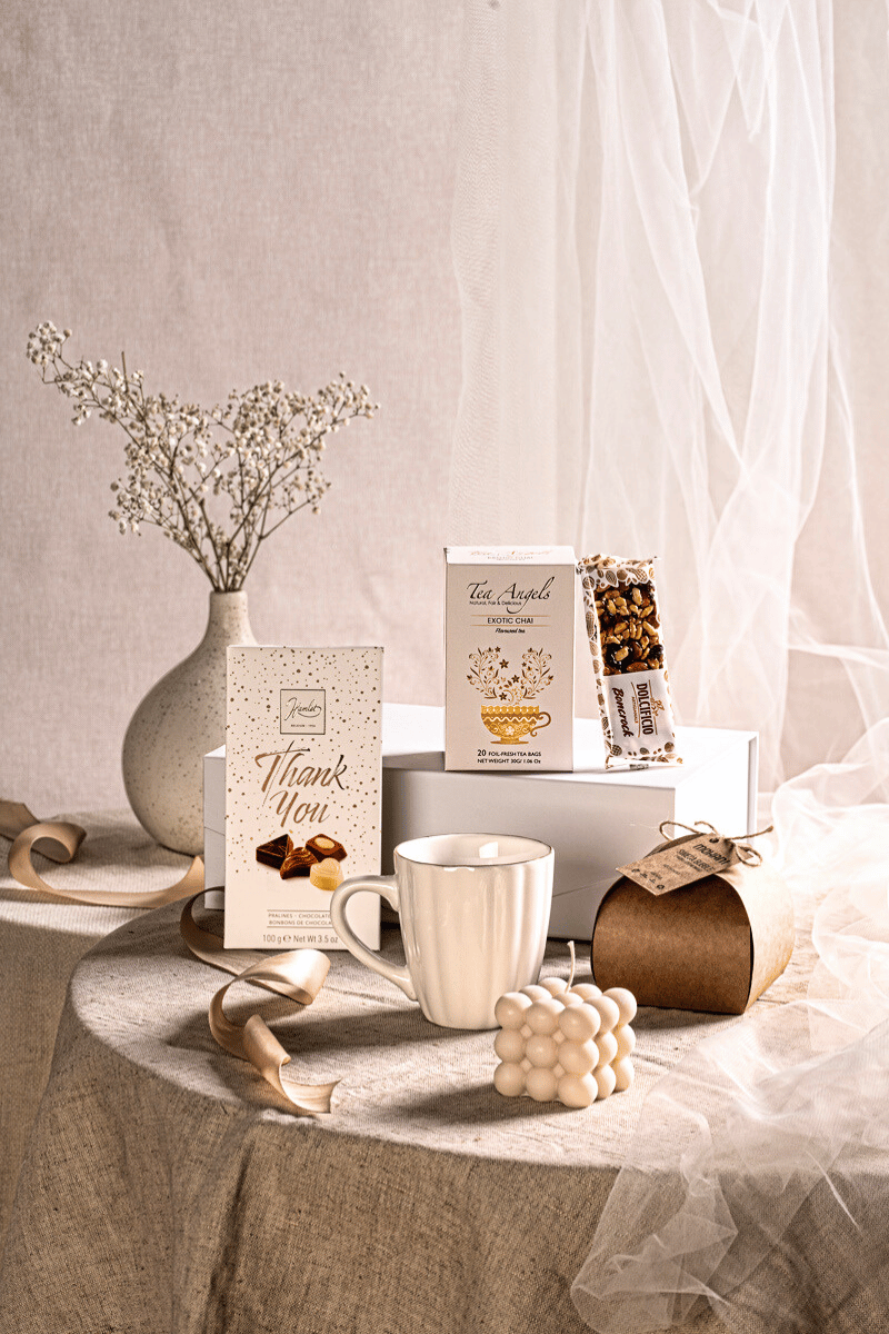 Elegancki Zestaw Prezentowy z Herbatą, Świecą i Belgijskimi Pralinami