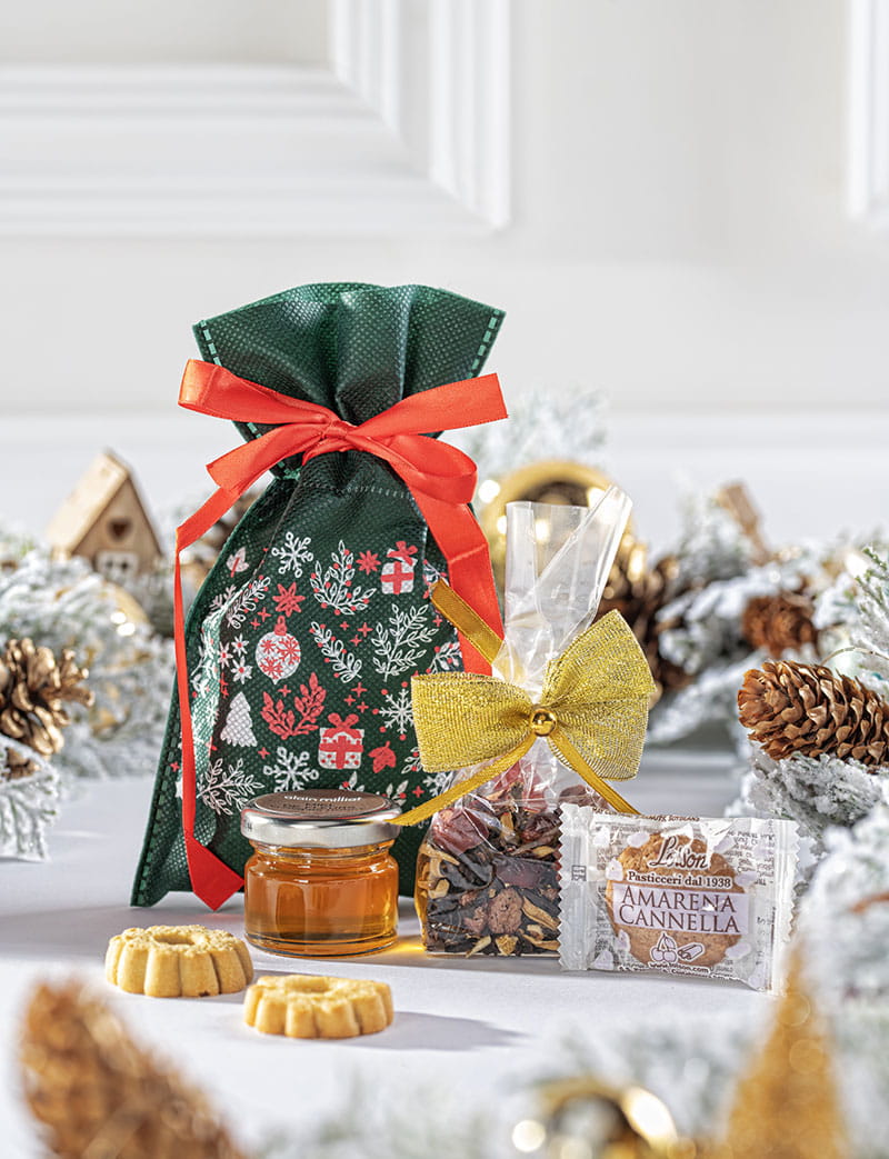 Zestaw zapakowany jest w elegancki woreczek z włókna w zielonym kolorze, ozdobiony świąteczną grafiką i przewiązany srebrną wstążką. Całość prezentuje się niezwykle estetycznie, stanowiąc gotowy do wręczenia upominek. Wymiary torby: 20 × 12 cm.