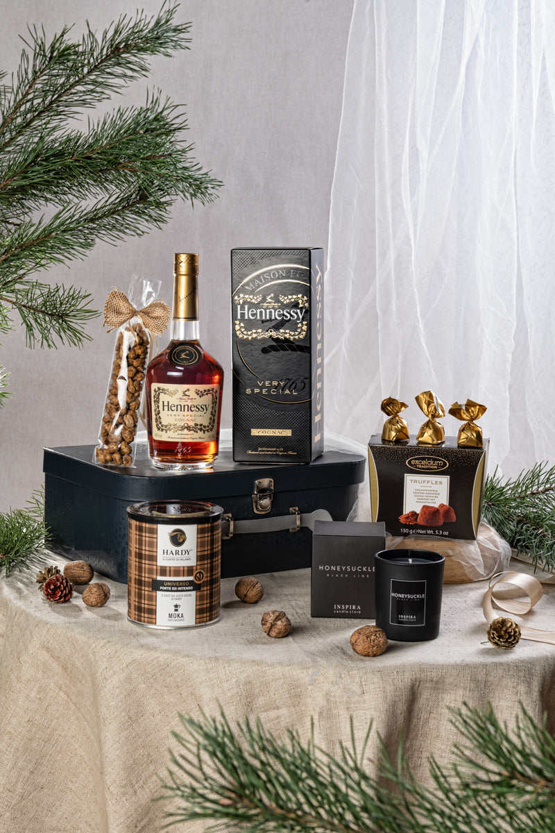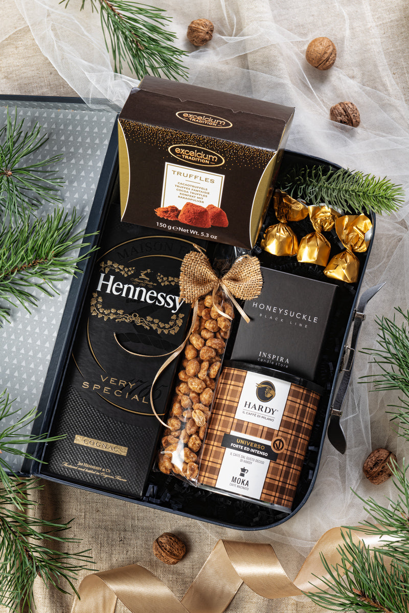 Podaruj elegancję i luksus w jednym zestawie — idealny upominek dla koneserów wyrafinowanych smaków. Połączenie włoskiej kawy, czekoladek i luksusowego koniaku Hennessy tworzy wyjątkową kompozycję, która zachwyci każdego obdarowanego.